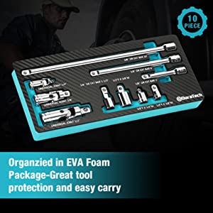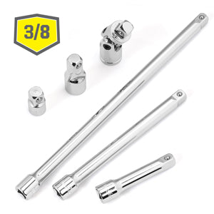 10 Pieces accessory set includes: 3/8’’ Drive Extension Bars ( 1-1/2’’, 3’’, 6” and 10’’ ), Universal Joints (1/4’’, 3/8’’, 1/2’’ Drive ), Adapters(1/4’’, 3/8’’, 1/2’’ Drive).