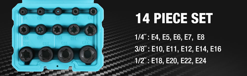 Includes: E4, E5, E6, E7, E8; 3/8-inch drive: E10, E11, E12, E14, E16; 1/2-inch drive: E18, E20, E22, E24