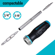 Multi-bit screwdriver with double-ended 1/4" & 5/16" shafts that can be used as nut drivers to easily access tight work spaces.